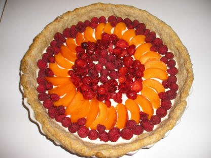 When the pie crust is cool, pour the ricotta mixture into the bottom of the pan, and put the filled shell into the refrigerator. No need to bake the ricotta, because there are no eggs. When the crust and cheese are chilled, decorate the cheese filling with fresh fruit, including raspberries, strawberries, pitted cherries, sliced apricots, peaches and/or plums, Then eat. It makes a great desert, but we also eat it for breakfast.